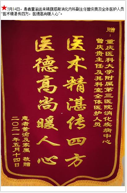 患者董渝送来锦旗感谢消化内科副主任曾庆贵及全体医护人员“医术精湛传四方,医德高尚暖人心”-锦旗-患者心声-患者服务-重庆医科大学附属第三医院【官方网站】