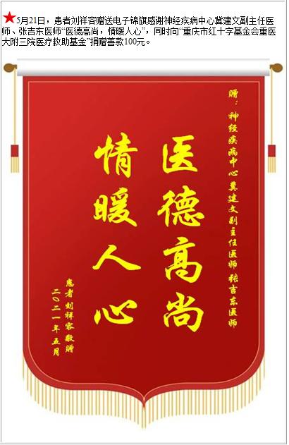 患者刘祥容赠送电子锦旗感谢神经疾病中心冀建文副主任医师等人,并向医疗救助基金捐赠善款100元-锦旗-患者心声-患者服务-重庆医科大学附属第三医院【官方网站】