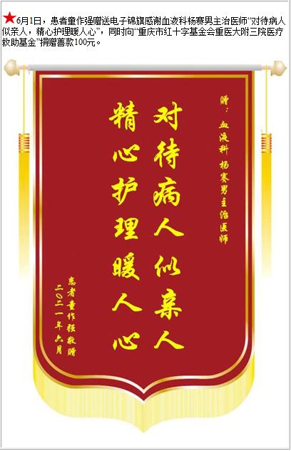 患者童作强赠送电子锦旗感谢血液科杨赛男主治医师,并向医疗救助基金捐赠善款100元-锦旗-患者心声-患者服务-重庆医科大学附属第三医院【官方网站】