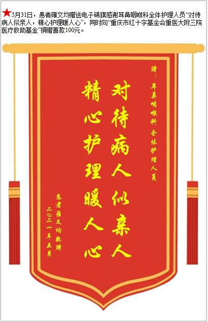 患者雍文均赠送电子锦旗感谢耳鼻咽喉科全体护理人员,并向医疗救助基金捐赠善款100元-锦旗-患者心声-患者服务-重庆医科大学附属第三医院【官方网站】