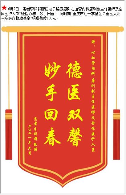 患者李祥群赠送电子锦旗感谢心血管内科唐刚副主任医师及全体医护人员,并向医疗救助基金捐赠善款100元-锦旗-患者心声-患者服务-重庆医科大学附属第三医院【官方网站】
