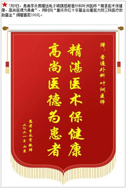 患者李永贵赠送电子锦旗感谢普外科叶洲医师,并向医疗救助基金捐赠善款100元-锦旗-患者心声-患者服务-重庆医科大学附属第三医院【官方网站】
