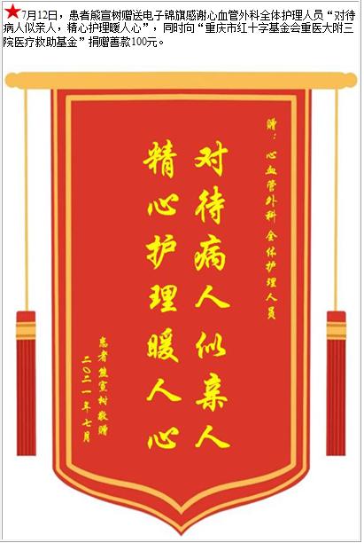 患者熊宣树赠送电子锦旗感谢心血管外科全体护理人员,并向医疗救助基金捐赠善款100元-锦旗-患者心声-患者服务-重庆医科大学附属第三医院【官方网站】