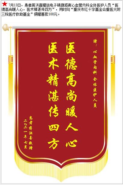 患者蒋洪喜赠送电子锦旗感谢心血管内科全体医护人员,并向医疗救助基金捐赠善款100元-锦旗-患者心声-患者服务-重庆医科大学附属第三医院【官方网站】