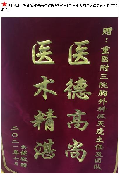 患者余健送来锦旗感谢胸外科主任汪天虎“医德高尚,医术精湛”-锦旗-患者心声-患者服务-重庆医科大学附属第三医院【官方网站】