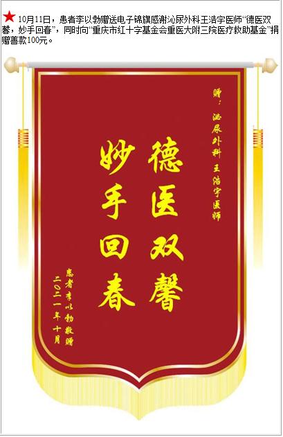 患者李以勃赠送电子锦旗感谢沁尿外科王浩宇医师,并向医疗救助基金捐赠善款100元-锦旗-患者心声-患者服务-重庆医科大学附属第三医院【官方网站】