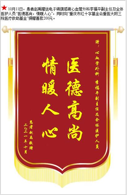患者赵禹赠送电子锦旗感谢心血管外科李福平副主任及全体医护人员,并向医疗救助基金捐赠善款200元-锦旗-患者心声-患者服务-重庆医科大学附属第三医院【官方网站】
