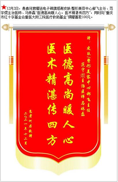 患者何君赠送电子锦旗感谢皮肤/整形美容中心郝飞主任等人,并向医疗救助基金捐赠善款100元-锦旗-患者心声-患者服务-重庆医科大学附属第三医院【官方网站】