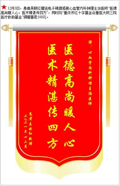 患者吴晓红赠送电子锦旗感谢心血管内科钟理主治医师,并向医疗救助基金捐赠善款100元-锦旗-患者心声-患者服务-重庆医科大学附属第三医院【官方网站】