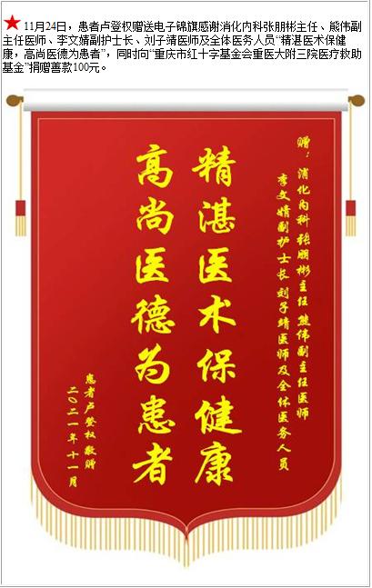 患者卢登权赠送电子锦旗感谢消化内科张朋彬主任等人及全体医务人员,并向医疗救助基金捐赠善款100元-锦旗-患者心声-患者服务-重庆医科大学附属第三医院【官方网站】