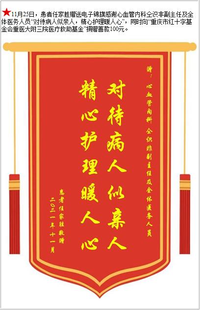 患者任家胜赠送电子锦旗感谢心血管内科仝识非副主任及全体医务人员,并向医疗救助基金捐赠善款100元-锦旗-患者心声-患者服务-重庆医科大学附属第三医院【官方网站】