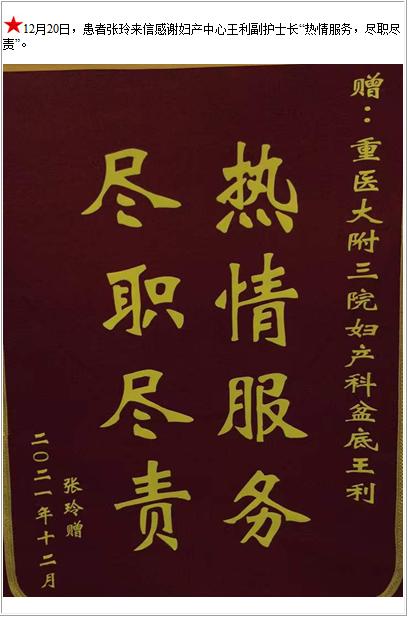 患者张玲来信感谢妇产中心王利副护士长“热情服务,尽职尽责”-锦旗-患者心声-患者服务-重庆医科大学附属第三医院【官方网站】