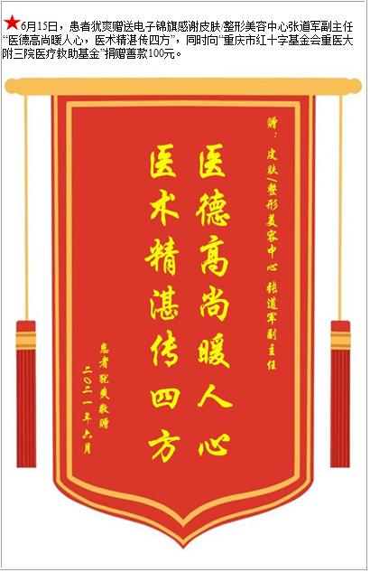 患者犹爽赠送电子锦旗感谢皮肤/整形美容中心张道军副主任,并向医疗救助基金捐赠善款100元-锦旗-患者心声-患者服务-重庆医科大学附属第三医院【官方网站】