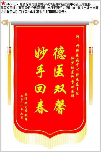 患者徐克苏赠送电子锦旗感谢神经疾病中心张云东主任等人,并向医疗救助基金捐赠善款100元-锦旗-患者心声-患者服务-重庆医科大学附属第三医院【官方网站】