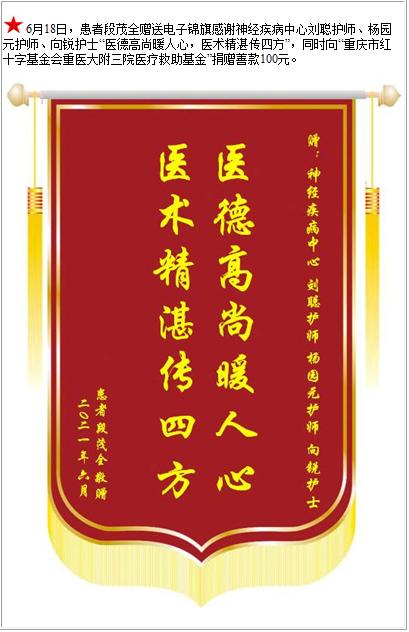 患者段茂全赠送电子锦旗感谢神经疾病中心刘聪护师等人,并向医疗救助基金捐赠善款100元-锦旗-患者心声-患者服务-重庆医科大学附属第三医院【官方网站】
