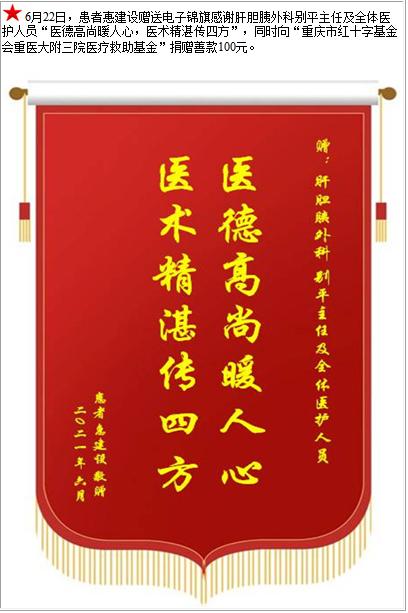 患者惠建设赠送电子锦旗感谢肝胆胰外科别平主任及全体医护人员,并向医疗救助基金捐赠善款100元-锦旗-患者心声-患者服务-重庆医科大学附属第三医院【官方网站】