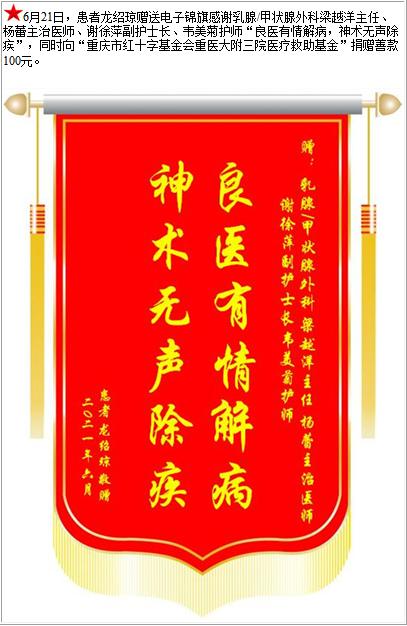 患者龙绍琼赠送电子锦旗感谢乳腺/甲状腺外科梁越洋主任等人,并向医疗救助基金捐赠善款100元。-锦旗-患者心声-患者服务-重庆医科大学附属第三医院【官方网站】