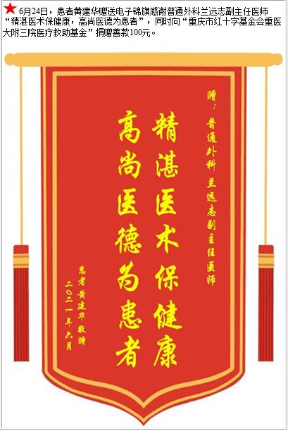 患者黄建华赠送电子锦旗感谢普通外科兰远志副主任医师,并向医疗救助基金捐赠善款100元-锦旗-患者心声-患者服务-重庆医科大学附属第三医院【官方网站】