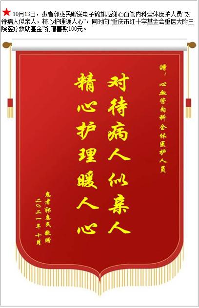 患者郭惠民赠送电子锦旗感谢心血管内科全体医护人员,并向医疗救助基金捐赠善款100元-锦旗-患者心声-患者服务-重庆医科大学附属第三医院【官方网站】