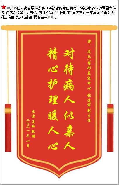 患者夏玮赠送电子锦旗感谢皮肤/整形美容中心张道军副主任,并向医疗救助基金捐赠善款100元-锦旗-患者心声-患者服务-重庆医科大学附属第三医院【官方网站】