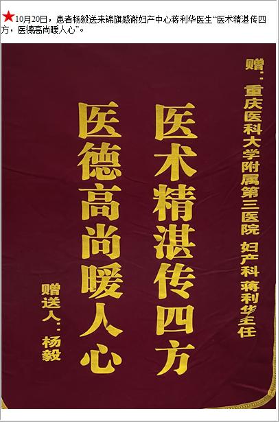 患者杨毅送来锦旗感谢妇产中心蒋利华医生“医术精湛传四方,医德高尚暖人心”-锦旗-患者心声-患者服务-重庆医科大学附属第三医院【官方网站】