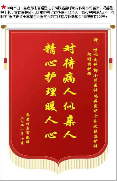患者邱志富赠送电子锦旗感谢呼吸内科郭小莉医师等人,并向医疗救助基金捐赠善款100元-锦旗-患者心声-患者服务-重庆医科大学附属第三医院【官方网站】