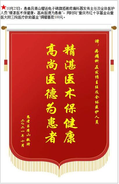 患者吕清山赠送电子锦旗感谢疼痛科聂发传主任及全体医护人员,并向医疗救助基金捐赠善款100元-锦旗-患者心声-患者服务-重庆医科大学附属第三医院【官方网站】