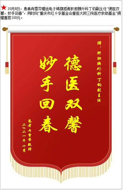 患者冉雪芬赠送电子锦旗感谢肝胆胰外科丁钧副主任,并向医疗救助基金捐赠善款100元-锦旗-患者心声-患者服务-重庆医科大学附属第三医院【官方网站】