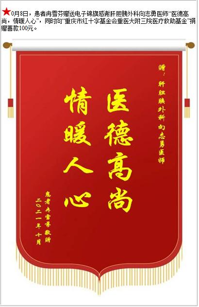 患者冉雪芬赠送电子锦旗感谢肝胆胰外科向志勇医师,并向医疗救助基金捐赠善款100元-锦旗-患者心声-患者服务-重庆医科大学附属第三医院【官方网站】