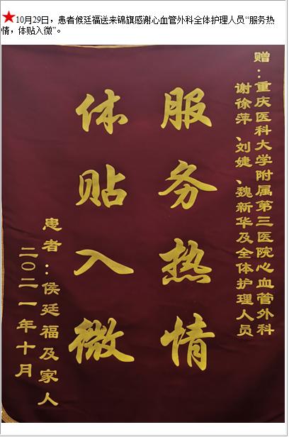 患者候廷福送来锦旗感谢心血管外科全体护理人员“服务热情,体贴入微”-锦旗-患者心声-患者服务-重庆医科大学附属第三医院【官方网站】