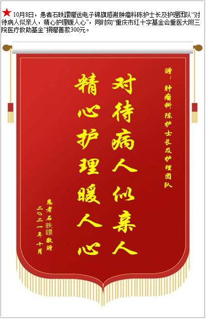 患者石昳譞赠送电子锦旗感谢肿瘤科陈护士长及护理团队,并向医疗救助基金捐赠善款300元-锦旗-患者心声-患者服务-重庆医科大学附属第三医院【官方网站】