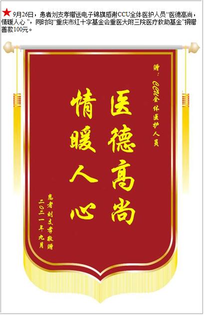 患者刘支孝赠送电子锦旗感谢CCU全体医护人员,并向医疗救助基金捐赠善款100元-锦旗-患者心声-患者服务-重庆医科大学附属第三医院【官方网站】