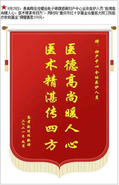 患者陶佳佳赠送电子锦旗感谢妇产中心全体医护人员,并向医疗救助基金捐赠善款100元-锦旗-患者心声-患者服务-重庆医科大学附属第三医院【官方网站】