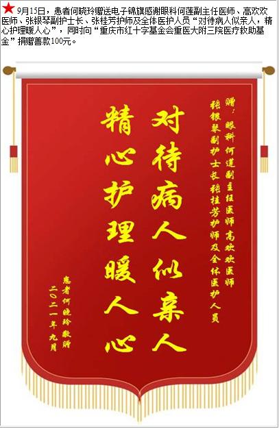 患者何晓玲赠送电子锦旗感谢眼科何莲副主任医师等人及全体医护人员,并向医疗救助基金捐赠善款100元-锦旗-患者心声-患者服务-重庆医科大学附属第三医院【官方网站】