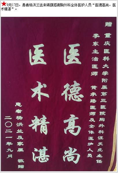 患者杨洪兰送来锦旗感谢胸外科全体医护人员“医德高尚,医术精湛”-锦旗-患者心声-患者服务-重庆医科大学附属第三医院【官方网站】