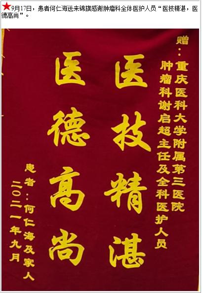 患者何仁海送来锦旗感谢肿瘤科全体医护人员“医技精湛,医德高尚”-锦旗-患者心声-患者服务-重庆医科大学附属第三医院【官方网站】