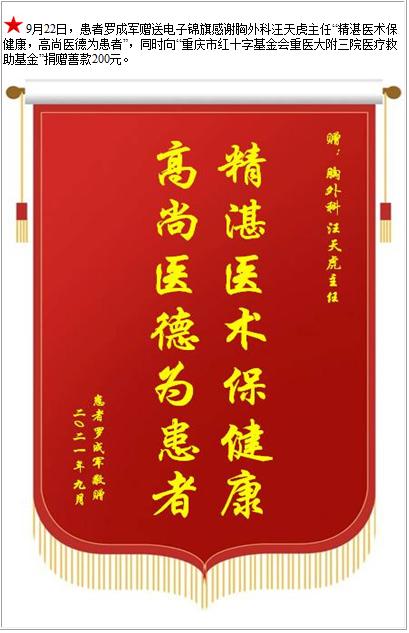 患者罗成军赠送电子锦旗感谢胸外科汪天虎主任,并向疗救助基金捐赠善款200元-锦旗-患者心声-患者服务-重庆医科大学附属第三医院【官方网站】