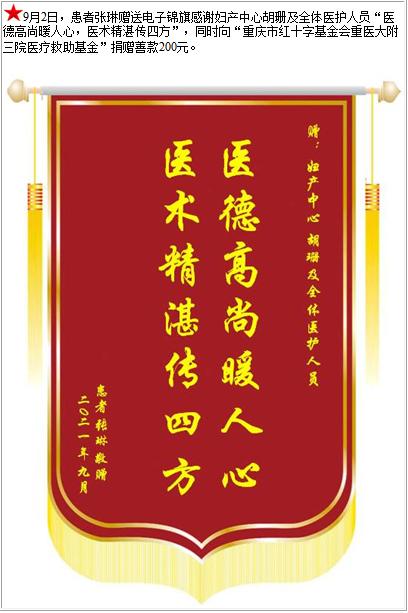 患者张琳赠送电子锦旗感谢妇产中心胡珊及全体医护人员,并向医疗救助基金捐赠善款200元-锦旗-患者心声-患者服务-重庆医科大学附属第三医院【官方网站】