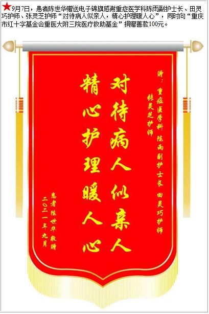 患者陈世华赠送电子锦旗感谢重症医学科陈雨副护士长等人,并向医疗救助基金捐赠善款100元-锦旗-患者心声-患者服务-重庆医科大学附属第三医院【官方网站】