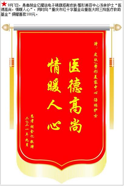 患者胡金亿赠送电子锦旗感谢皮肤/整形美容中心汤林护士,并向医疗救助基金捐赠善款100元-锦旗-患者心声-患者服务-重庆医科大学附属第三医院【官方网站】