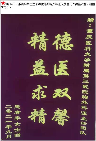 患者李女士送来锦旗感谢胸外科汪天虎主任“德医双馨,精益求精”-锦旗-患者心声-患者服务-重庆医科大学附属第三医院【官方网站】