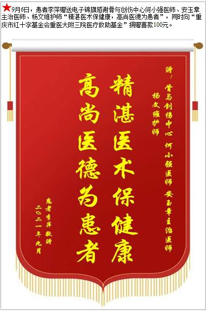 患者李萍赠送电子锦旗感谢骨与创伤中心何小强医师等人,并向医疗救助基金捐赠善款100元-锦旗-患者心声-患者服务-重庆医科大学附属第三医院【官方网站】