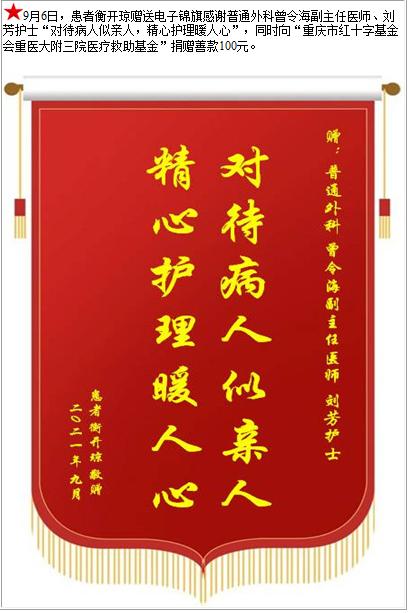 患者衡开琼赠送电子锦旗感谢普通外科曾令海副主任医师等人,并向医疗救助基金捐赠善款100元-锦旗-患者心声-患者服务-重庆医科大学附属第三医院【官方网站】