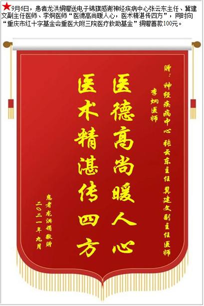 患者龙洪娟赠送电子锦旗感谢神经疾病中心张云东主任等人,并向医疗救助基金捐赠善款100元-锦旗-患者心声-患者服务-重庆医科大学附属第三医院【官方网站】