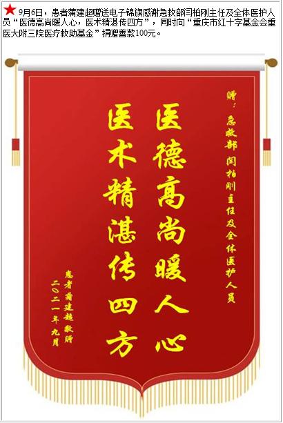 患者蒲建超赠送电子锦旗感谢急救部闫柏刚主任及全体医护人员,并向医疗救助基金捐赠善款100元-锦旗-患者心声-患者服务-重庆医科大学附属第三医院【官方网站】
