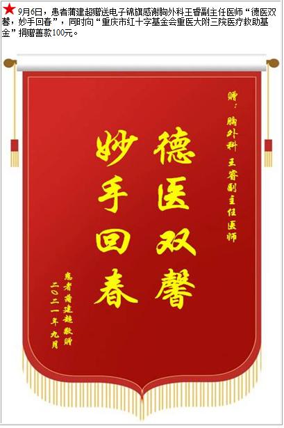 患者蒲建超赠送电子锦旗感谢胸外科王睿副主任医师,并向医疗救助基金捐赠善款100元-锦旗-患者心声-患者服务-重庆医科大学附属第三医院【官方网站】