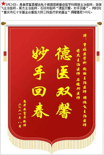 患者廖富昌赠送电子锦旗感谢重症医学科陶丽主治医师等人,并向医疗救助基金捐赠善款100元-锦旗-患者心声-患者服务-重庆医科大学附属第三医院【官方网站】