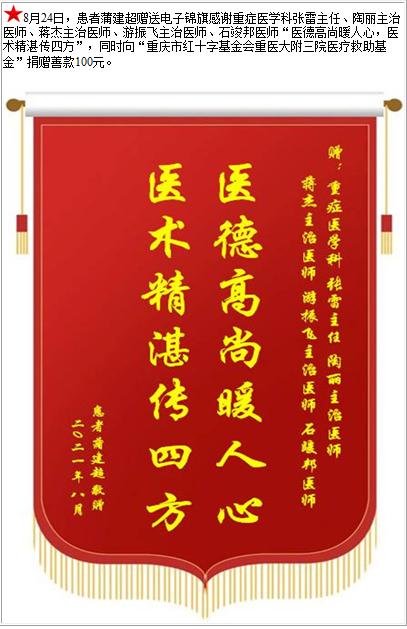 患者蒲建超赠送电子锦旗感谢重症医学科张雷主任等人,并向医疗救助基金捐赠善款100元-锦旗-患者心声-患者服务-重庆医科大学附属第三医院【官方网站】