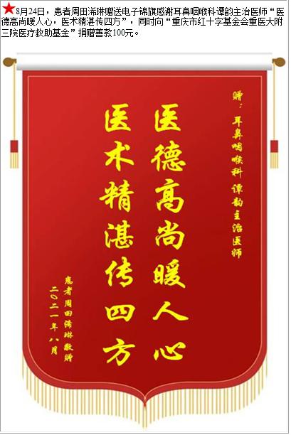 患者周田浠琳赠送电子锦旗感谢耳鼻咽喉科谭韵主治医师,并向医疗救助基金捐赠善款100元-锦旗-患者心声-患者服务-重庆医科大学附属第三医院【官方网站】