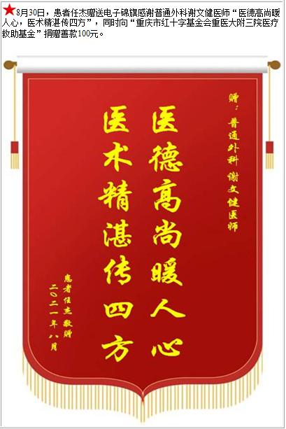 患者任杰赠送电子锦旗感谢普通外科谢文健医师,并向医疗救助基金捐赠善款100元-锦旗-患者心声-患者服务-重庆医科大学附属第三医院【官方网站】